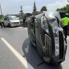 Kocaeli’nin Başiskele ilçesinde kamyonun çarpması neticesinde takla atan otomobil yan durdu.