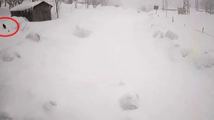 Kar kalınlığının yaklaşık 1 buçuk metreyi bulduğu bölgedeki görüntülerde yiyecek arayan kurdun, yayla evlerinin bulunduğu yere kadar geldiği görülüyor.