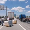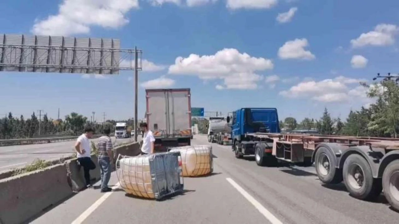 Kocaeli'nin Gebze ilçesinde, D-100 karayolunda seyir halindeki tırdan kimyasal sıvı dolu tanklar yol düştü.