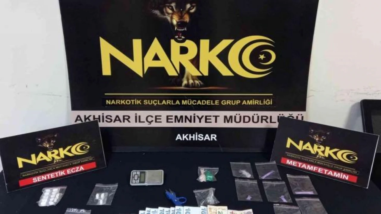 Manisa İl Emniyet Müdürlüğü Akhisar Narkotik Suçlarla Mücadele Grup Amirliği görevlilerince uyuşturucu veya uyarıcı madde ticareti yapan, nakleden ve kullanan şahıslara yönelik yapılan çalışmalarda Akhisar ilçesinde durdurulan bir araçta yapılan aramada; 7 parça halinde 3,57 gram metamfetamin maddesi, 17 adet sentetik ecza hapı, 1 adet hassas terazi, 1 adet uyuşturucu kullanmaya yarayan aparat, 2 adet ölçüm yapmaya yarayan aparat, 1 adet uyuşturucu paketlemede kullanılan makas ve uyuşturucu madde ticaretinden elde edildiği değerlendirilen bin 285 TL para ele geçirildi. Konuyla ilgili 2 şüpheli şahıs ’Uyuşturucu veya uyarıcı madde imal ve ticareti yapmak’ suçundan gözaltına alınarak haklarında adli işlemlere başlandı.