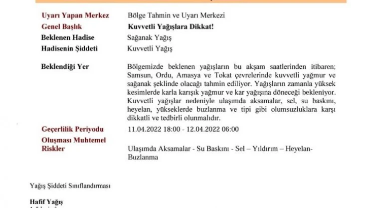 “Bölgemizde beklenen yağışların bu akşam saatlerinden itibaren; Samsun, Ordu, Amasya ve Tokat çevrelerinde kuvvetli yağmur ve sağanak şeklinde olacağı tahmin ediliyor. Yağışların zamanla yüksek kesimlerde karla karışık yağmur ve kar yağışına döneceği bekleniyor. Kuvvetli yağışlar nedeniyle ulaşımda aksamalar, sel, su baskını, heyelan, yükseklerde buzlanma ve tipi gibi olumsuzluklara karşı dikkatli ve tedbirli olunmalıdır.”
