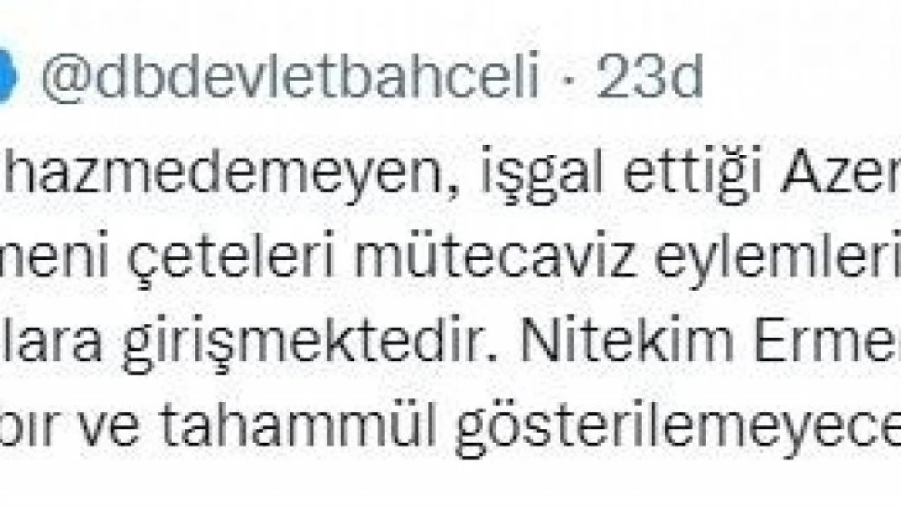 MHP Genel Başkanı Devlet Bahçeli, Azerbaycan-Ermenistan sınırında yaşanan gerilimin ardından Azerbaycan’ı destekleyen sosyal medya paylaşımında bulundu.
