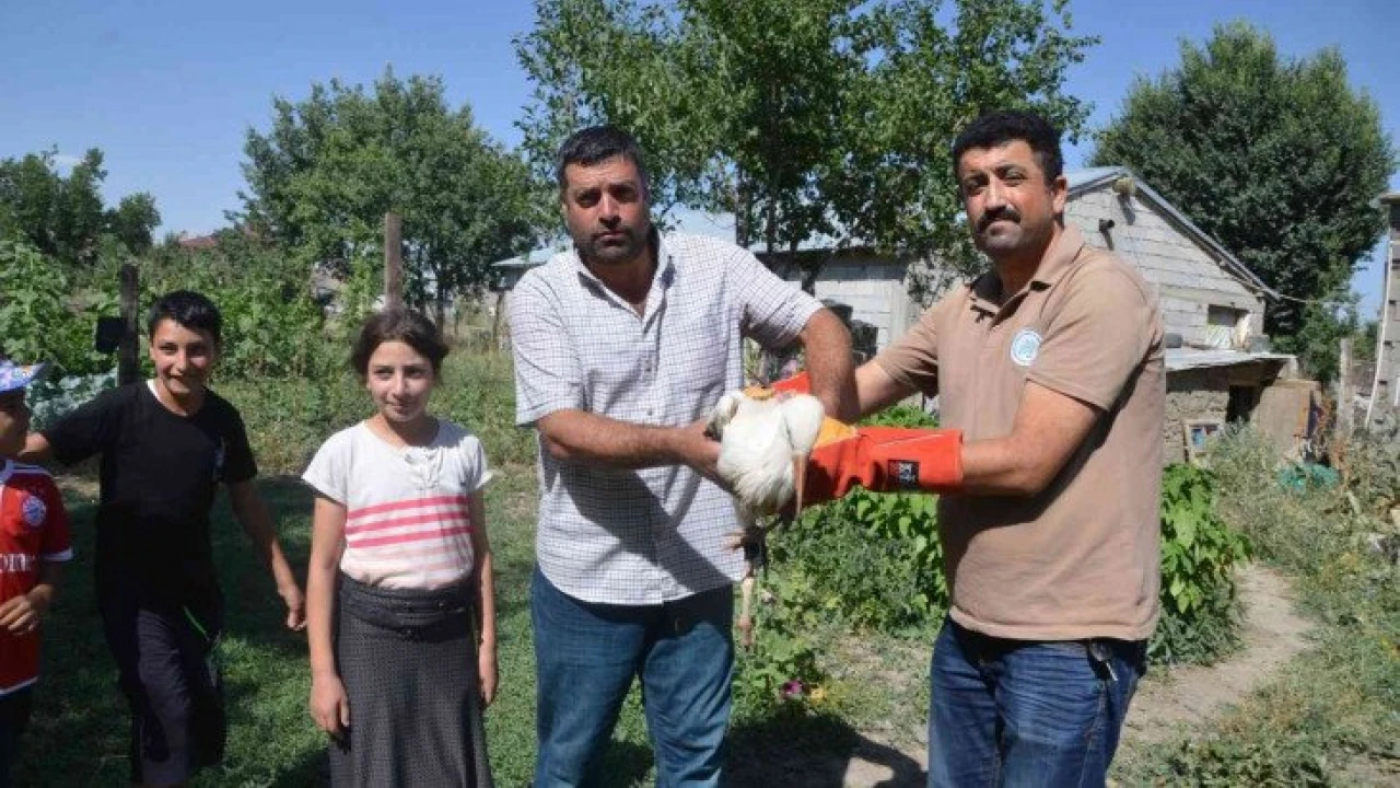 Muş'ta bir evin çatısındaki yuvasından düşerek ayağı kırılan leylek yavrusu tedavi altına alındı.
