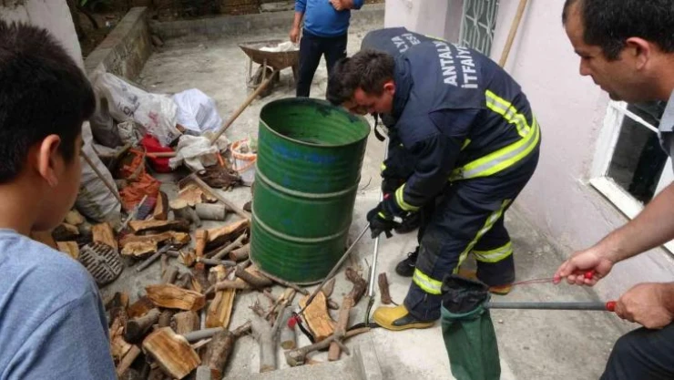 Şelale Mahallesi 3540 sokak adresinden gelen yılan ihbarına giden itfaiye ekibi, Musa Şenol isimli vatandaşa ait ikametin önünde bulunan odunluktaki yılanı ararken sıcak havanında etkisiyle zor anlar yaşadı. Çocukların ve vatandaşların heyecanlı bekleyişi arasında odunluktaki tüm odunları dışarı çıkaran ve aktaran itfaiye görevlileri, yılanı bulduktan sonra bu kez de yakalamak için çaba harcadı.