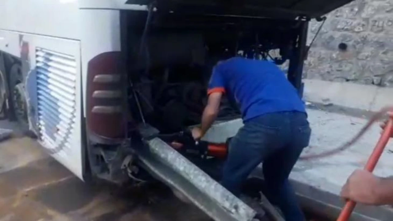 Bitlis'te meydana gelen trafik kazasında, yol kenarındaki bariyer otobüsün önünden girerek arkasında çıktı.