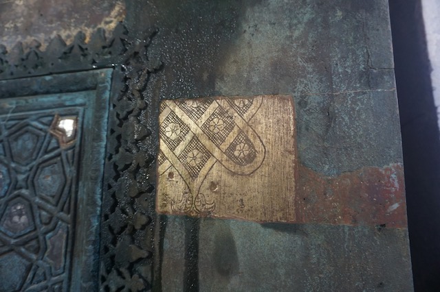 “Cami revaklı avlusuna üç yönden bronz kapılar ile giriş yapılmaktadır. Kapılarda geometrik geçmeler dışında, ajurlu demir menteşe klapaları bile kazıma tekniği ile işlenmiştir. Ahşaptaki gibi serenlerle üç parçaya ayrılmış, her parça farklı geçmelerden oluşmuş, özellikle orta parça kakmalı gibi, bolca rumi desenle işlenmiştir."