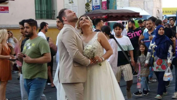 Taksim'de yabancı uyruklu gelin ve damadın fotoğraf çekimleri İstiklal caddesini kilitledi. Çekim yapan çiftin etrafında toplanan kişiler, caddede yoğun kalabalık oluşturdu. Vatandaşlar zaman zaman yürümekte güçlük çekti.
