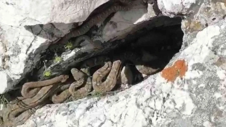 Yaylaya giden Mehmet Ceyhan adlı genç, kenger topladığı sırada bir kaya oyuğundan gelen sesleri duydu. Seslerin geldiği bölgeye giden Ceyhan, oyukta birbirine sarılmış 10’dan fazla engerek yılanını gördü. Birkaçı da araziden yuvaya doğru gelen yılanları, elindeki sopayla uzaklaştırmaya çalışan Ceyhan, hemen cep telefonunu açarak bu nadir olayı kayıt altına aldı.