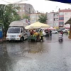 Yoğun yağan yağmur sebebiyle yolda su birikintileri oluştu. Vatandaşlar ise yağmurun durmasının ardından alışverişlerine devam ettiler.