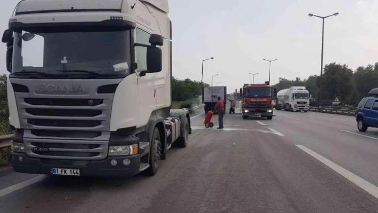 Anadolu Otoyolu Sakarya geçişinde sac yüklü tırın dorse kısmında çıkan yangın, sürücüler ve itfaiye ekiplerinin müdahalesi sonrasında söndürüldü.