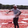 İzmir Torbalı'da üretilen 'kırmızı altın' domatesler, her yıl olduğu gibi bu yıl da kurutulmak üzere güneşe serildi. 100 milyon dolar ihracat hedefiyle kurutulan domatesler, gelincik tarlasını andırdı. Torbalı'nın kurutulmuş domateslerini en çok Amerika Birleşik Devletleri'nin (ABD) tercih ettiğini kaydeden Torbalı Ticaret Odası (TTO) Başkanı Abdulvahap Olgun, 'Daha önce kuru domateslerimizi en çok İtalyanlar kullanıyordu ama geçen yıl ABD birinci sırada yer aldı. Gurur duyarak söylüyorum ABD'de yenilen hamburgerlerde bizim kurutulmuş domatesimiz var' dedi.