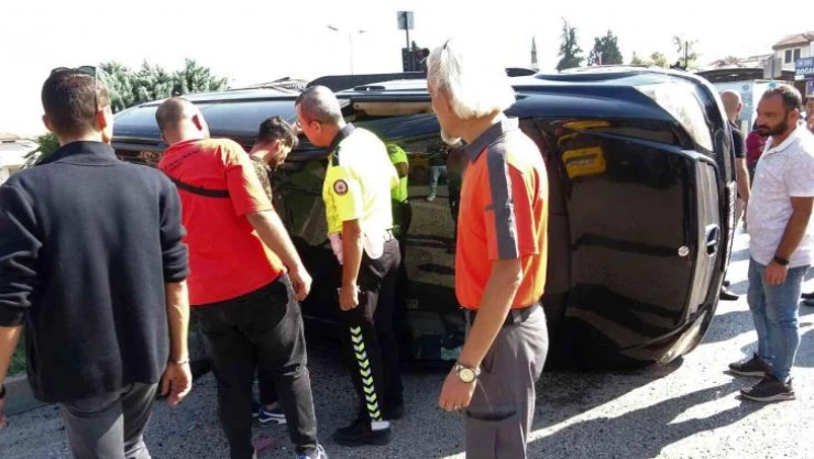 Bursa'da kırmızı ışık ihlali yapan tur minibüsü, hasta nakil minibüsüne arkadan çarptıktan sonra yan yattı. Şoför ise camdan kendi imkanıyla çıktı.
