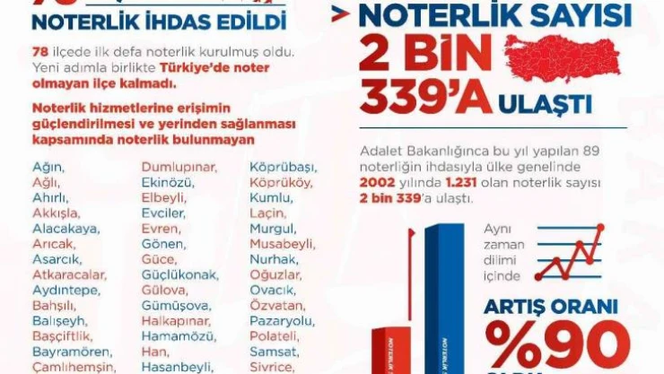 Noterlik hizmetlerine erişimin güçlendirilmesi ve yerinden sağlanması kapsamında noterlik bulunmayan Ağın, Ağlı, Ahırlı, Akkışla, Alacakaya, Arıcak, Asarcık, Atkaracalar, Aydıntepe, Bahşılı, Balışeyh, Başçiftlik, Bayramören, Çamlıhemşin, Çanakçı, Çelebi, Damal, Derbent, Derebucak, Derepazarı, Dernekpazarı, Dikmen, Doğankent, Doğanşar, Doğanyol, Doğanyurt, Dumlupınar, Ekinözü, Elbeyli, Evciler, Evren, Gönen, Güce, Güçlükonak, Gülova, Gümüşova, Halkapınar, Hamamözü, Han, Hasanbeyli, Hasankeyf, Hayrat, Hemşin, İbradı, İnhisar, Kabadüz, Kale, Karakoyunlu, Karkamış, Kızılören, Kofçaz, Korgun, Köprübaşı, Köprüköy, Kumlu, Laçin, Murgul, Musabeyli, Nurhak, Oğuzlar, Ovacık, Özvatan, Pazaryolu, Polateli, Samsat, Sivrice, Sumbas, Süloğlu, Şenpazar, Termal, Tillo, Tuzlukçu, Yakakent, Yalıhüyük, Yayladere, Yedisu, Yenişarbademli, Yeşilli ilçelerine noterlik kurulacak.