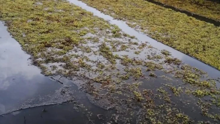Manisa’da etkili olan sağanak yağış nedeniyle sergilerde kurutulmaya bırakılan üzümler su altında kaldı.