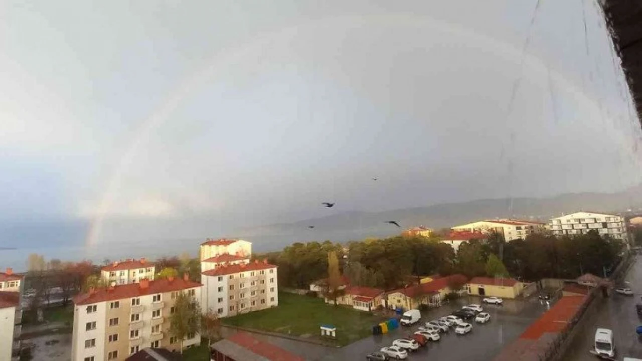 Bitlis'in Tatvan ilçesinde aniden bastıran sağanak yağış sonrasında Van Gölü üzerinde çıkan gökkuşağının oluşturduğu renk cümbüşü, görenleri hayran bıraktı.